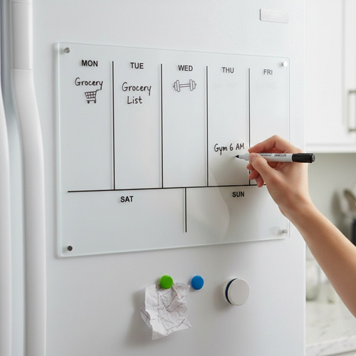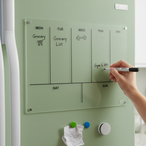 این تخته پلکسی شفاف با ضخامت 3 میلی‌متر ساخته شده و برای یادداشت کارهای روزانه، برنامه‌ریزی و نوشتن یادآوری‌ها طراحی شده است. چهار گوشه آن دارای آهنربای قوی است تا بدون نیاز به چسب، روی در یخچال یا هر سطح فلزی محکم قرار بگیرد و هنگام نوشتن جابه‌جا نشود. سطح صاف و باکیفیت پلکسی امکان نوشتن با ماژیک وایت‌برد و پاک‌کردن راحت و بدون رد را فراهم می‌کند. نوشته‌های روی تخته در دو رنگ مشکی و سفید تولید می‌شود؛ به‌طوری‌که اگر سطح پشت آن روشن باشد، نوشته مشکی بهترین خوانایی را دارد، و اگر زمینه تیره باشد، نوشته سفید انتخاب مناسب‌تری است. طراحی ساده و مینیمال این تخته باعث می‌شود در هر محیطی از آشپزخانه تا محل کار به‌راحتی با دکور هماهنگ شود و همیشه در دید قرار بگیرد. ابعاد دقیق محصول در بخش مشخصات درج شده است تا بتوانید اندازه مناسب فضای خود را انتخاب کنید.